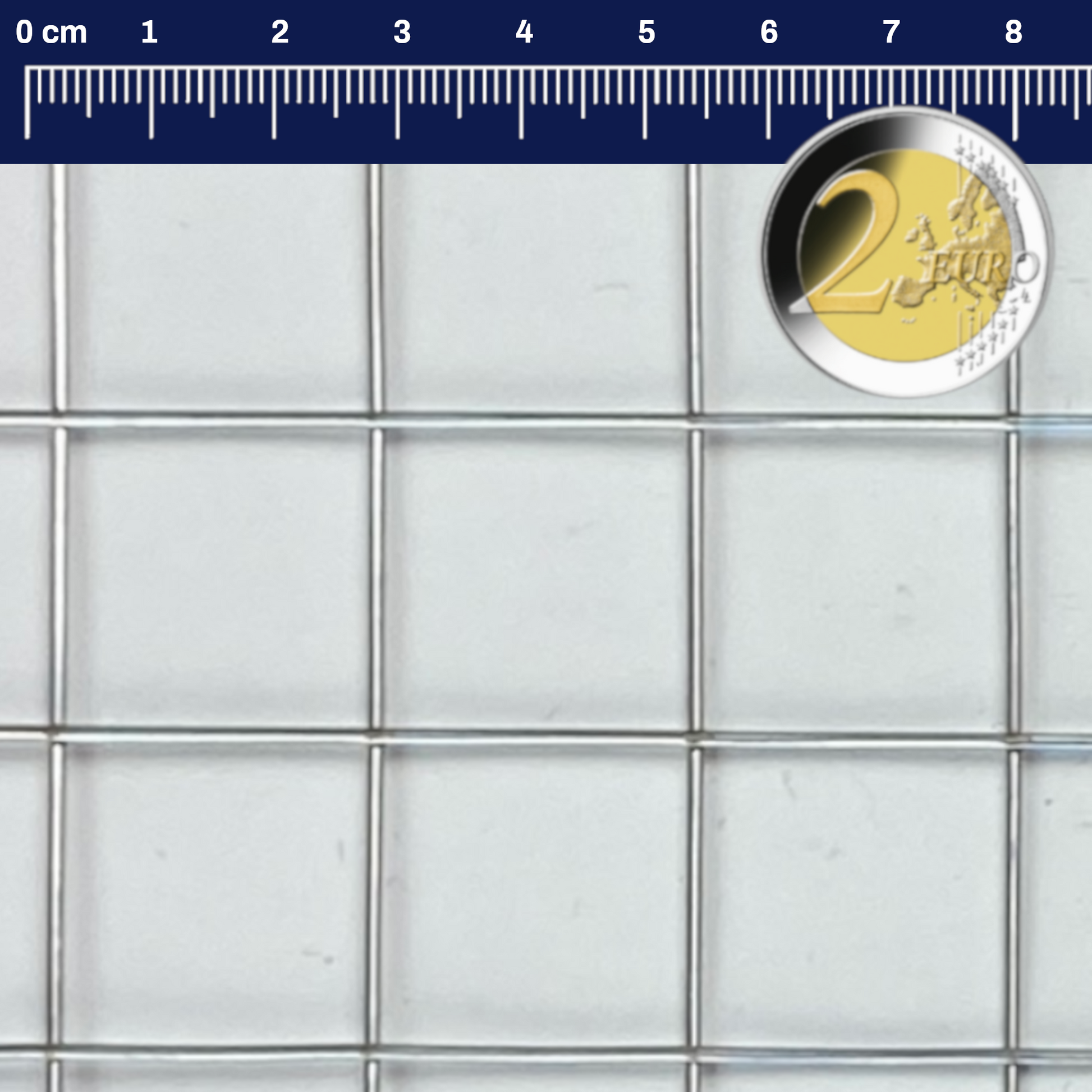 Rete saldata in filo di acciaio inox, con fili longitudinali e trasversali saldati in modo stabile ad ogni punto di incrocio.